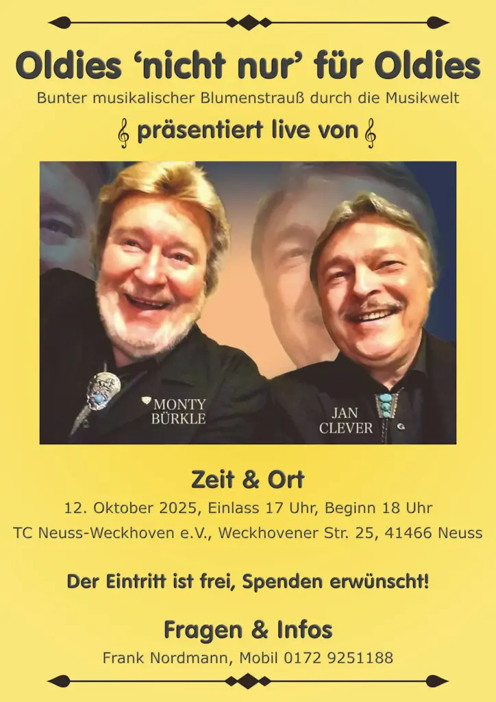 Am Sonntag, 12. Oktober 2025, waren die Profimusiker und Entertainer Monty Bürkle (Posaune, Akustikgitarre, Gesang) und Jan Clever (Trompete, Keyboard, Gesang) zu Gast im Clubhaus des TC Neuss-Weckhoven e.V. (TCW) an der Weckhovener Str. 25. Motto des musikalischen Abends: "Oldies 'nicht nur' für Oldies, Musik für Jung & Alt".