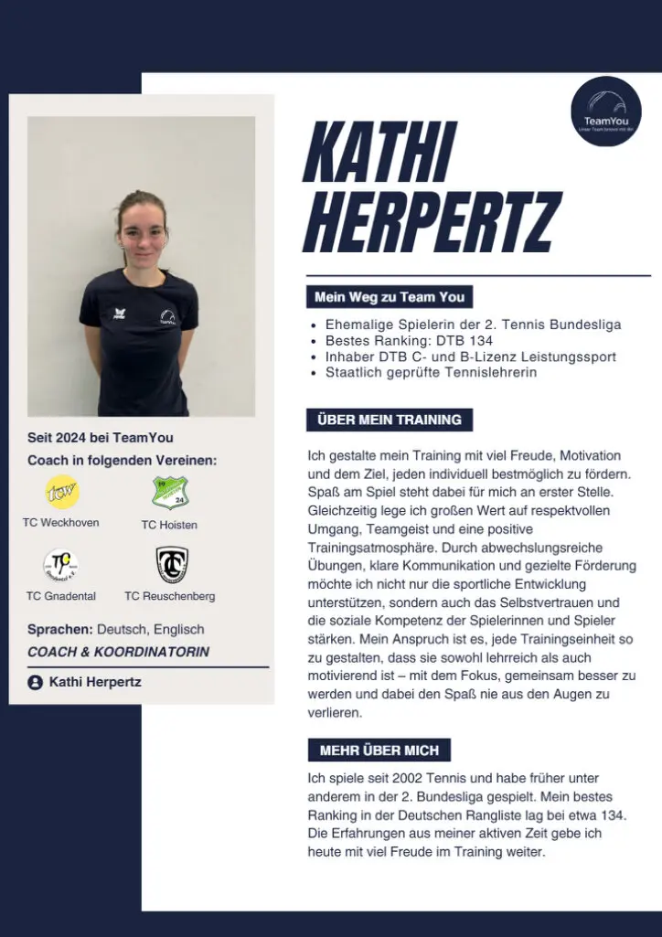 Im Januar 2025 hat Katharina 'Kathi' Herpertz von der Tennisschule TeamYou die Aufgabe der TeamYou-Koordinatorin im