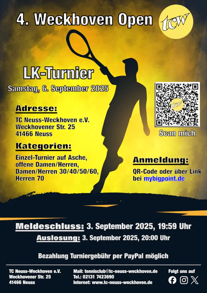 Hinweis: Auch in der kommenden Tennissaison 2026 möchten wir allen Tennisfreunden wieder LK-Turniere in Neuss-Weckhoven anbieten.