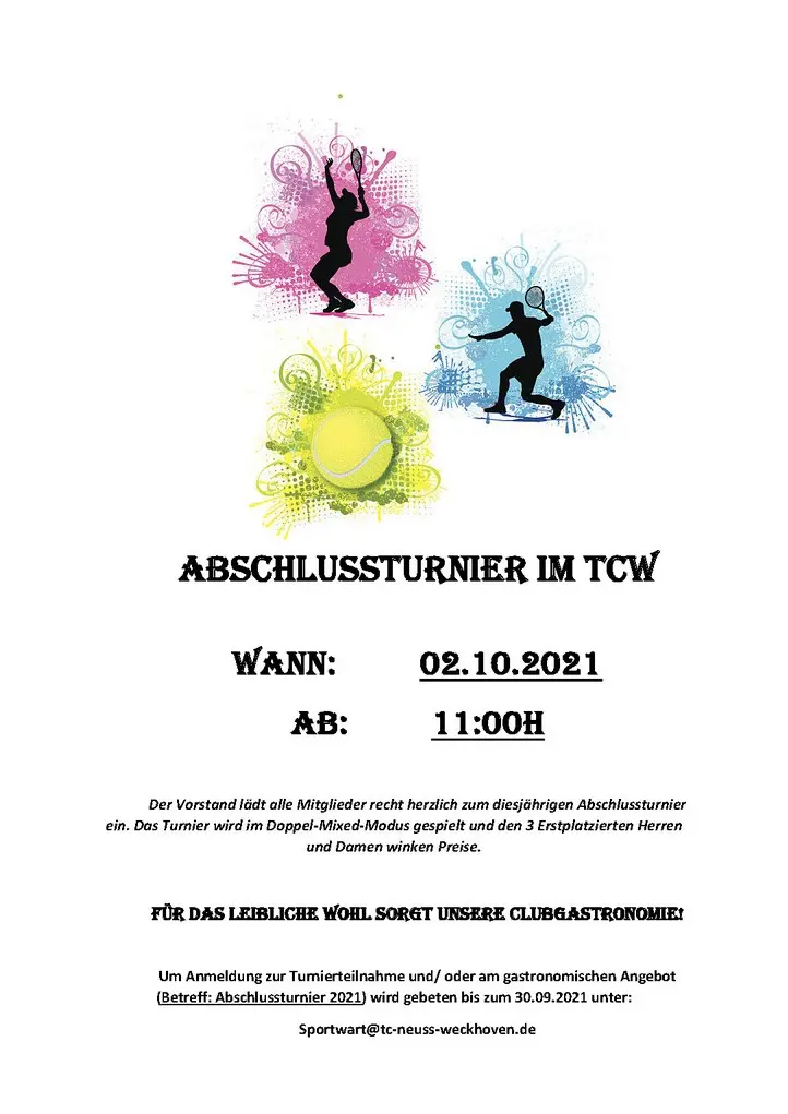 Am Samstag, 2. Oktober 2021, konnten sich die Vereinsmitglieder ab 11:00 Uhr auf das Abschlussturnier des Tennisclubs Neuss-Weckhoven e.V. (TCW) im Doppel-Mixed und Einzel freuen. Trotz Urlaubszeit folgten zwanzig Teilnehmer der Einladung des TCW-Vorstands. Der Sportausschuss des TCW, besetzt am Turniertag mit Sportwartin Grit Andersen und Helmut Gräf, stellte die Spielpaarungen im Einzel und Doppel-Mixed kompetent und fair zusammen, so dass unterhaltsame und zugleich ausgeglichene Matches garantiert waren. Um den Matches eine besondere Würze zu geben, wurden die Spiele auf den Plätzen 1 bis 6 allesamt im sehr spannenden Tiebreak-Modus ausgetragen.