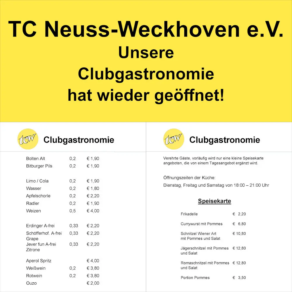 anbei eine wichtige Information von uns für euch: Unsere Clubgastronomie "Kleine Dorfkneipe im TCW" an der Weckhovener Str. schließt am 30. Dezember 2025. Aus gesundheitlichen Gründen ziehen sich die Pächter Angelika Steins und ihr beruflicher Partner Berthold Moll zurück.